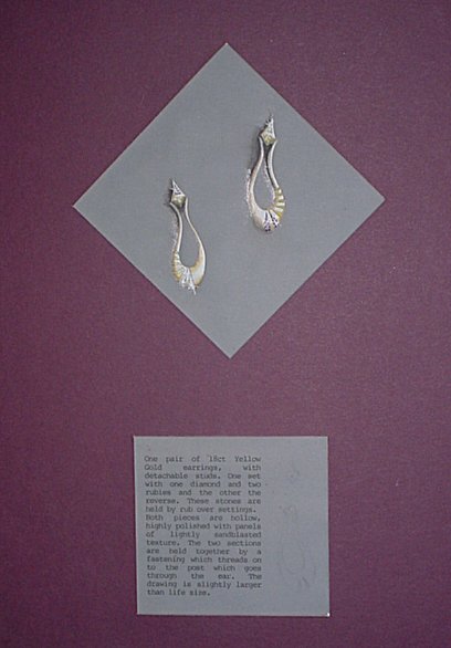Goldsmiths Award - 1992 This design drawing was for a pair of Earrings which could be worn during the day and be converted into something glamorous for the evening. Made from 18ct Gold, Diamonds and Rubies. I am the first person in Scotland ever to win this award. I was given the materials and had to make the finished pieces, which were exhibited in the Worshipful Company of Goldsmiths in London. These were only worn once - on my wedding day! |