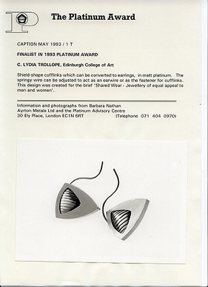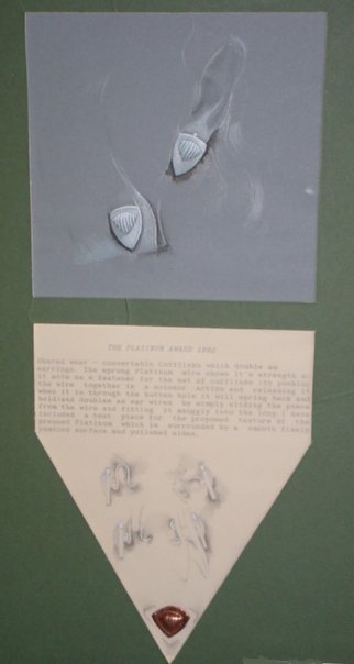 Winning Design Drawing - Platinum Awards - Finalist 1993. This design for duel Cufflinks/Earrings reached the top 10. Therefore I had the oppurtunity to make the finished design from Platinum. This metal is very difficult to work with. The metal had to be folded over and over to acheive the effect seen below in the finished photogragh, unfortunatley air bubbles keep appearing between the folds. But I managed it ! Great fun!